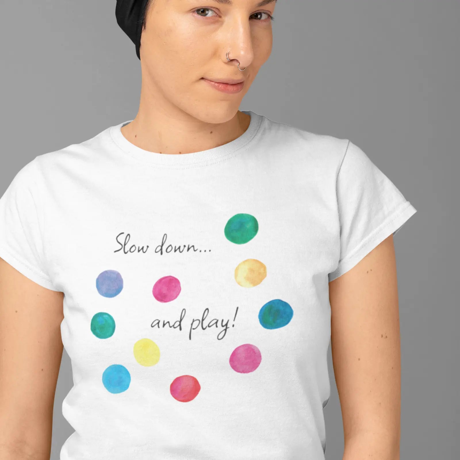 Tričko Slow down and play s puntíky malba Iva Kočíková