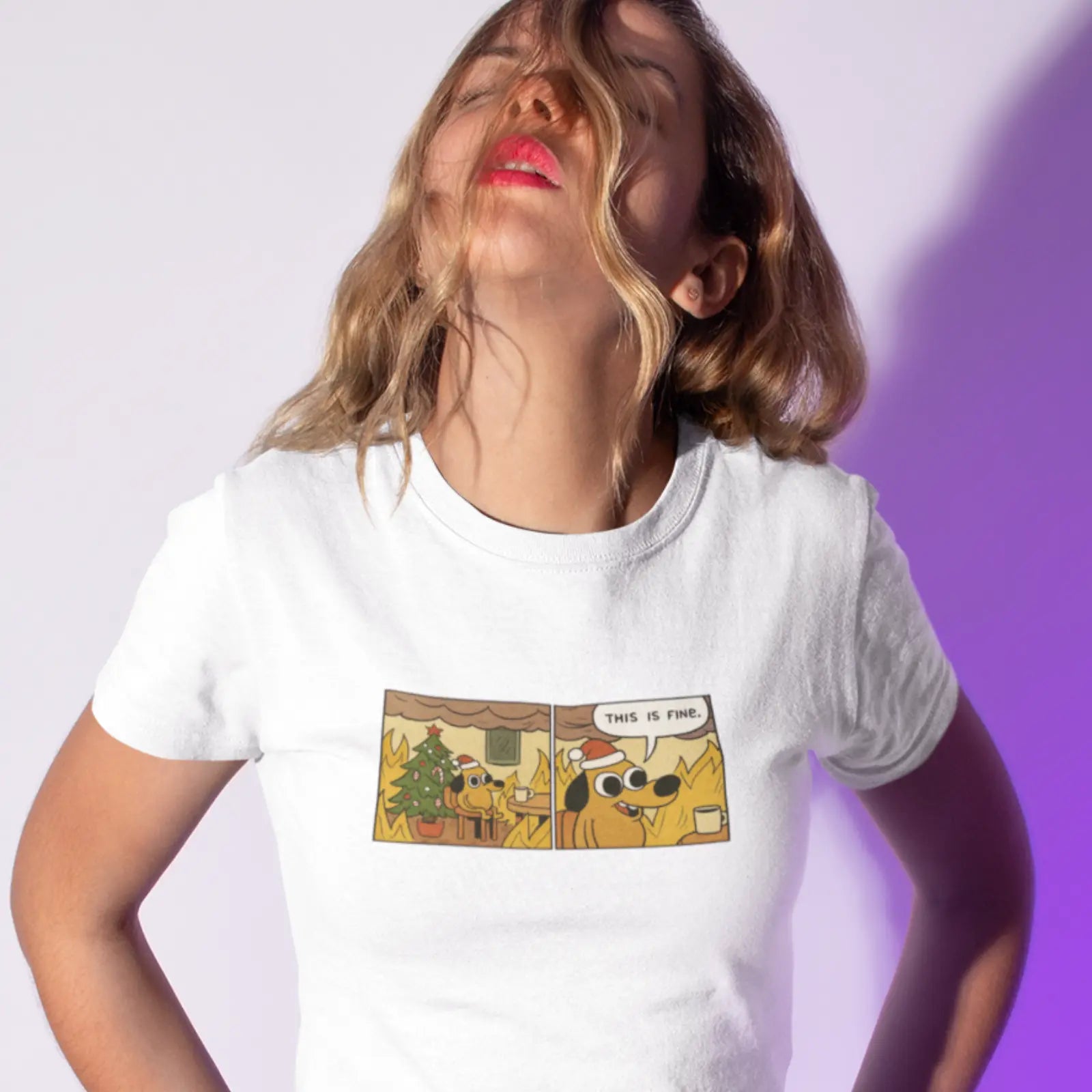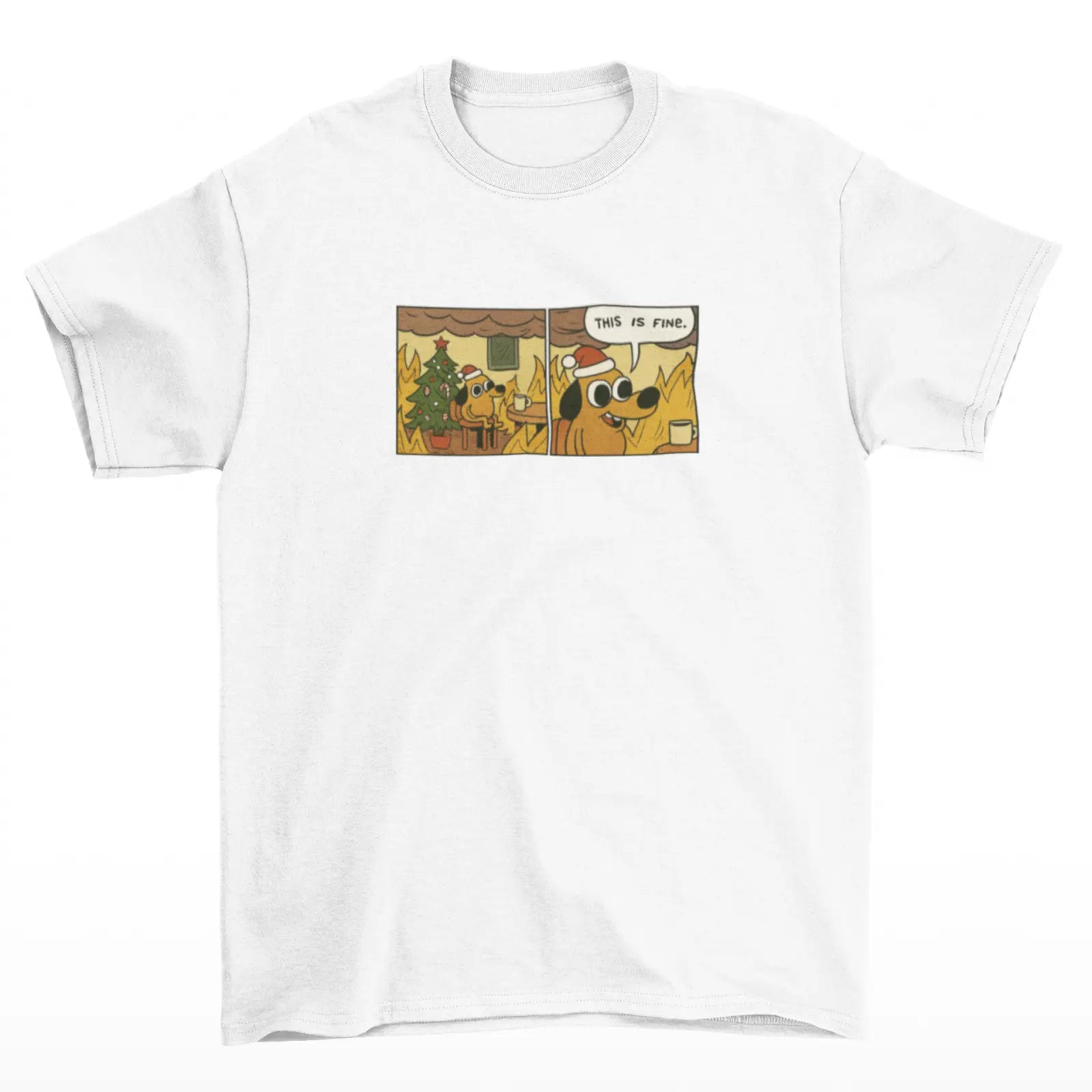 Ikonický meme ve vánoční verzi – pes v hořícím pokoji s vánoční výzdobou, který si říká, že je všechno v pořádku. Perfektní tričko pro všechny, kdo znají ten pocit předvánočního chaosu, stresu z nákupů dárků a rodinných setkání, ale navenek se tváří, že mají všechno pod kontrolou.